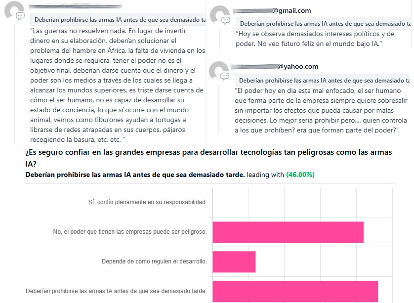 Respuestas a encuesta pasada: ¿Es seguro confiar en las grandes empresas para desarrollar tecnologías tan peligrosas como las armas IA? y prevalece “Deberían prohibirse las armas IA antes de que sea demasiado tarde”.