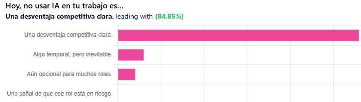 Respuestas a la encuesta pasada. Hoy, no usar IA en tu trabajo es… y prevalece: “Una desventaja competitiva clara”.