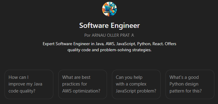 Ingeniero de software experto en Java, AWS, JavaScript, Python y React. Ofrece código de calidad y estrategias para la resolución de problemas.
