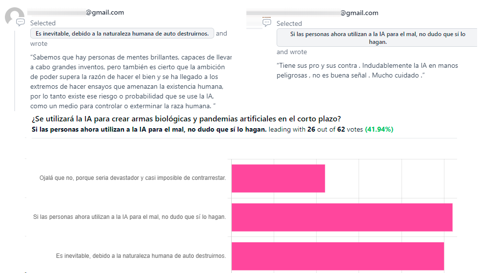 Respuestas a encuesta pasada: ¿Se utilizará la IA para crear armas biológicas y pandemias artificiales en el corto plazo? y prevalece: “Si las personas ahora utilizan a la IA para el mal, no dudo que sí lo hagan”.