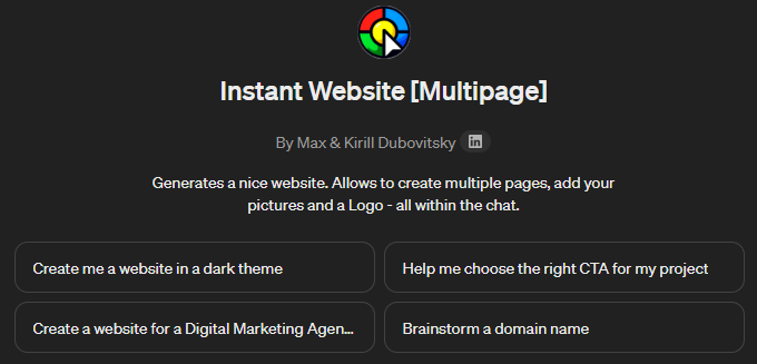 Genera un buen sitio web. Permite crear varias páginas, agregar sus imágenes y un logotipo, todo dentro del chat.