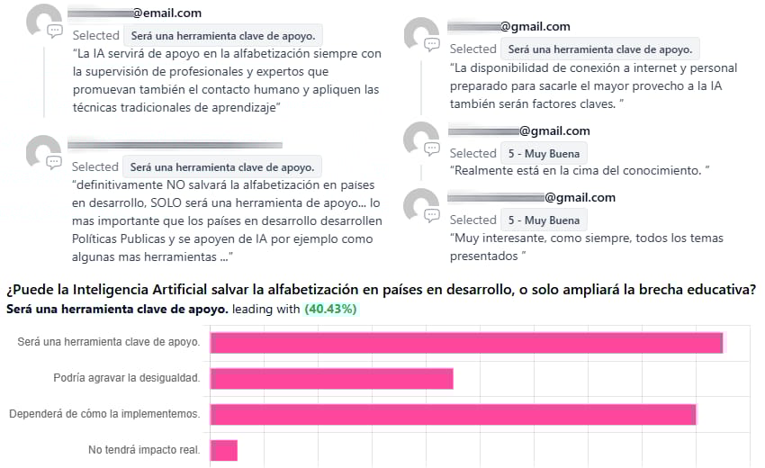 Respuestas a encuesta pasada: ¿Puede la Inteligencia Artificial salvar la alfabetización en países en desarrollo, o solo ampliará la brecha educativa? y prevalece: “Será una herramienta clave de apoyo”.