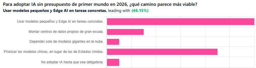 Respuestas a la encuesta pasada. Para adoptar IA sin presupuesto de primer mundo en 2026, ¿qué camino parece más viable? y prevalece: “Usar modelos pequeños y Edge AI en tareas concretas.