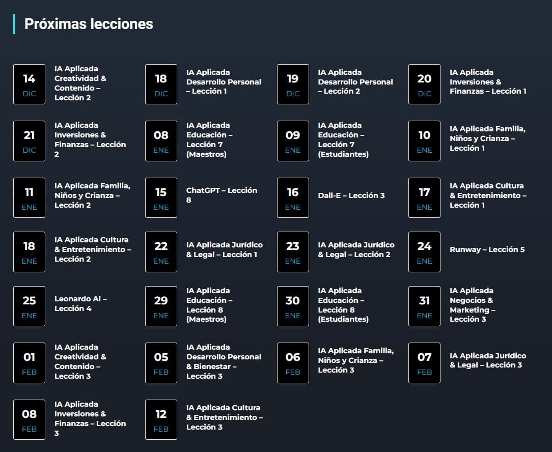 Este es el calendario de lecciones previsto hasta mediados de febrero de 2024. Ahora mismo ya hay más de 60 horas disponibles con contenido totalmente reciente, además cada semana publicamos 4 lecciones de 1 hora totalmente nuevas con lo último en el uso profesional de la Inteligencia Artificial.