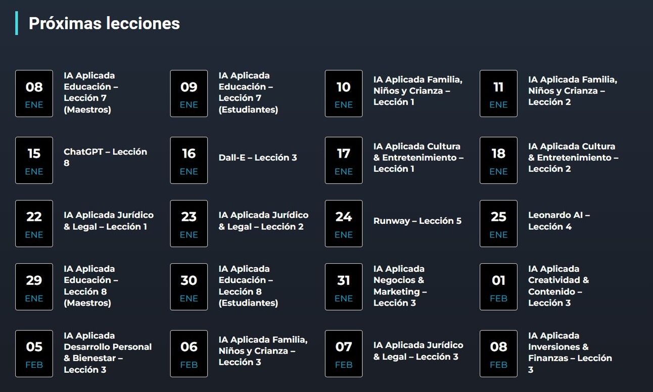 Este es el calendario de lecciones previsto hasta mediados de febrero de 2024. Ahora mismo ya hay más de 65 horas disponibles con contenido totalmente reciente, además cada semana publicamos 4 lecciones de 1 hora totalmente nuevas con lo último en el uso profesional de la Inteligencia Artificial.