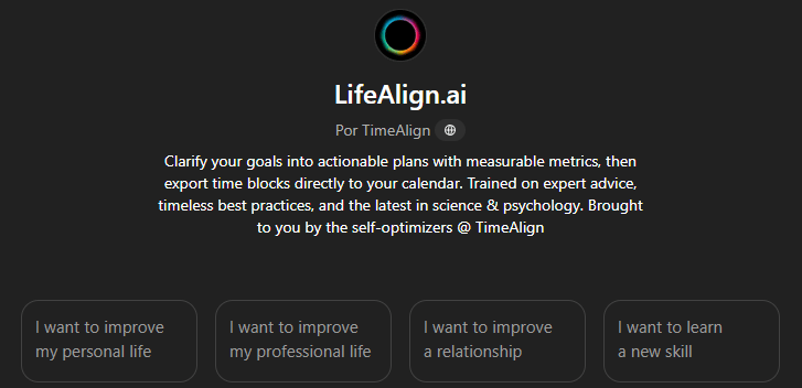 Define tus objetivos en planes viables con métricas medibles y exporta bloques de tiempo directamente a tu calendario. Capacitado con consejos de expertos, buenas prácticas atemporales y lo último en ciencia y psicología. Presentado por los autooptimizadores TimeAlign.