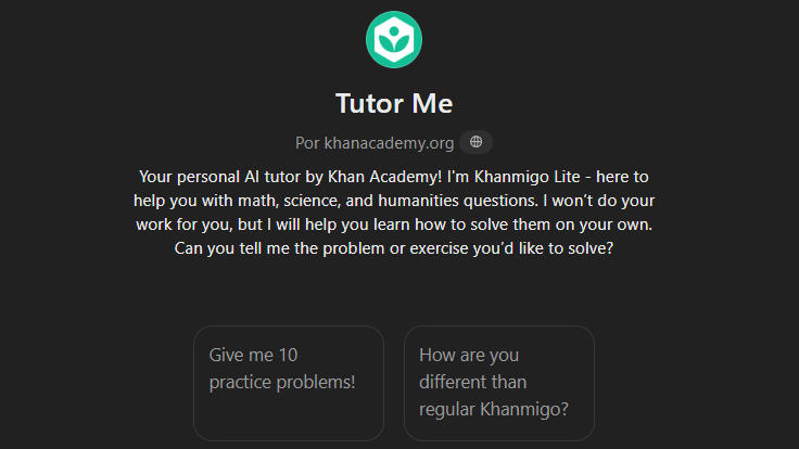 ¡Tu tutor personal de IA de Khan Academy! Soy Khanmigo Lite y estoy aquí para ayudarte con tus preguntas de matemáticas, ciencias y humanidades. No haré tu trabajo por ti, pero te ayudaré a aprender a resolverlos por ti mismo. ¿Puedes decirme el problema o ejercicio que te gustaría resolver?