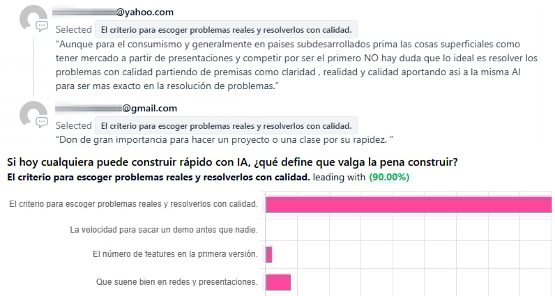 Respuestas a la encuesta pasada. Si hoy cualquiera puede construir rápido con IA, ¿qué define que valga la pena construir? y prevalece: “El criterio para escoger problemas reales y resolverlos con calidad”.