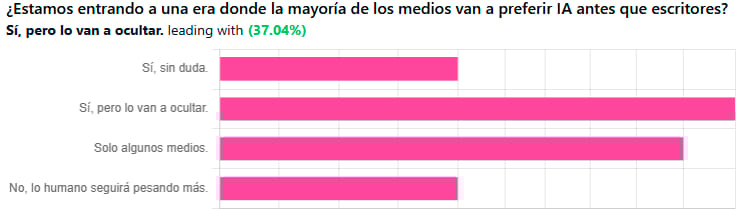 Respuestas a la encuesta pasada. ¿Estamos entrando a una era donde la mayoría de los medios van a preferir IA antes que escritores? y prevalece: “Sí, pero lo van a ocultar”.