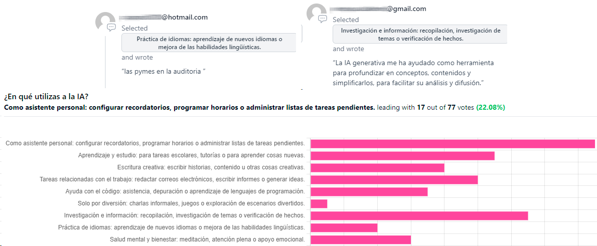 Respuestas a encuesta pasada: ¿En qué utilizas a la IA? y prevalece: “Como asistente personal: configurar recordatorios, programar horarios o administrar listas de tareas pendientes”.