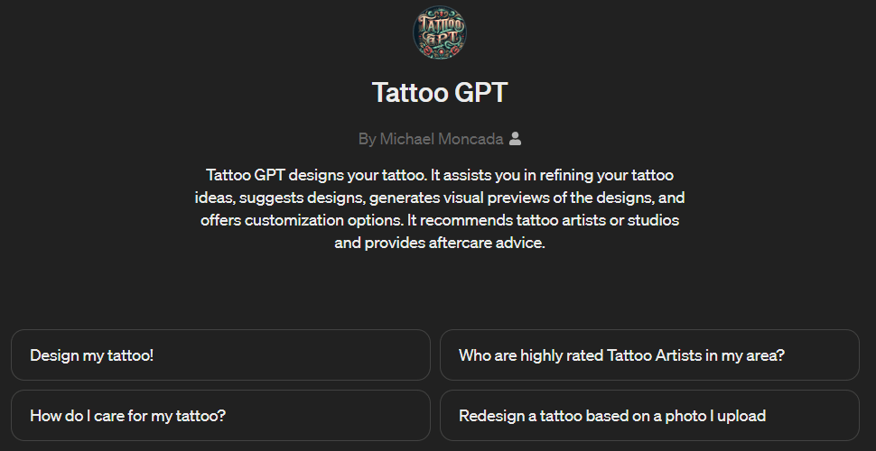 Tattoo GPT diseña tu tatuaje. Le ayuda a perfeccionar sus ideas de tatuajes, sugiere diseños, genera vistas previas visuales de los diseños y ofrece opciones de personalización. Recomienda artistas o estudios de tatuajes y brinda consejos sobre el cuidado posterior.