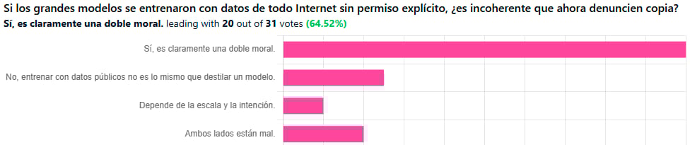 Respuestas a la encuesta pasada. Si los grandes modelos se entrenaron con datos de todo Internet sin permiso explícito, ¿es incoherente que ahora denuncien copia? y prevalece: “Sí, es claramente una doble moral”.