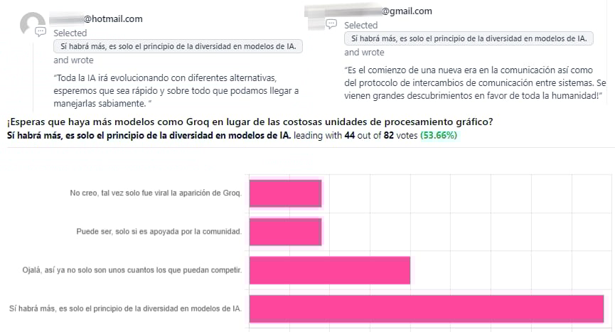 Respuestas a encuesta pasada: Como está el gasto de dinero en IA ¿Esperas que haya más modelos como Groq en lugar de las costosas unidades de procesamiento gráfico? y prevalece: “Sí habrá más, es solo el principio de la diversidad en modelos de IA”.