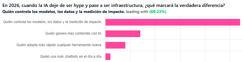 Respuestas a la encuesta pasada. Mirando a 2026, En 2026, cuando la IA deje de ser hype y pase a ser infraestructura, ¿qué marcará la verdadera diferencia? y prevalece: “Quién controla los modelos, los datos y la medición de impacto”.