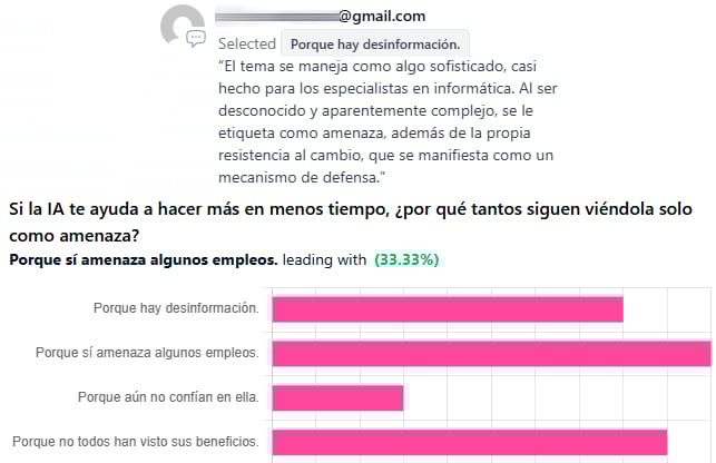 Respuestas a la encuesta pasada. Si la IA te ayuda a hacer más en menos tiempo, ¿por qué tantos siguen viéndola solo como amenaza? y prevalece: “Porque sí amenaza algunos empleos”.