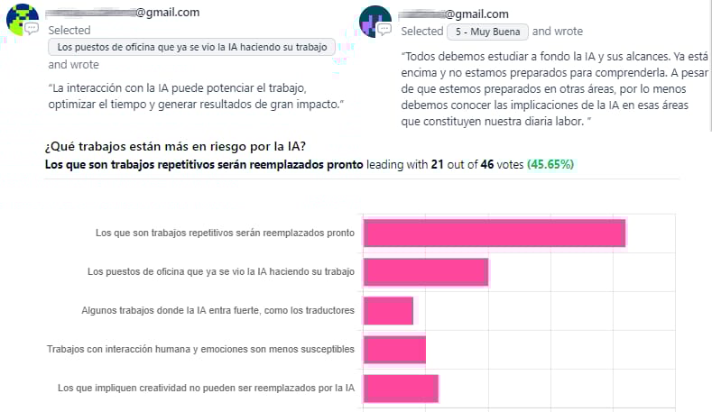 Respuestas a encuesta anterior: ¿Qué trabajos están más en riesgo por la IA? y va ganando “Los que son trabajos repetitivos serán reemplazados pronto”.