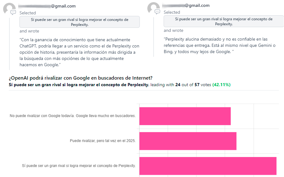 Respuestas a encuesta pasada: ¿OpenAI podrá rivalizar con Google en buscadores de Internet? y prevalece: “Sí puede ser un gran rival si logra mejorar el concepto de Perplexity”.
