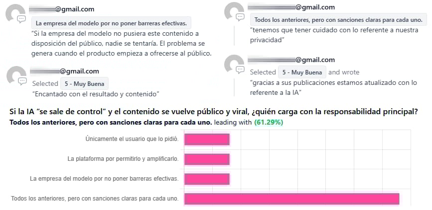 Respuestas a la encuesta pasada. Si la IA “se sale de control” y el contenido se vuelve público y viral, ¿quién carga con la responsabilidad principal? y prevalece: “Todos los anteriores, pero con sanciones claras para cada uno”.